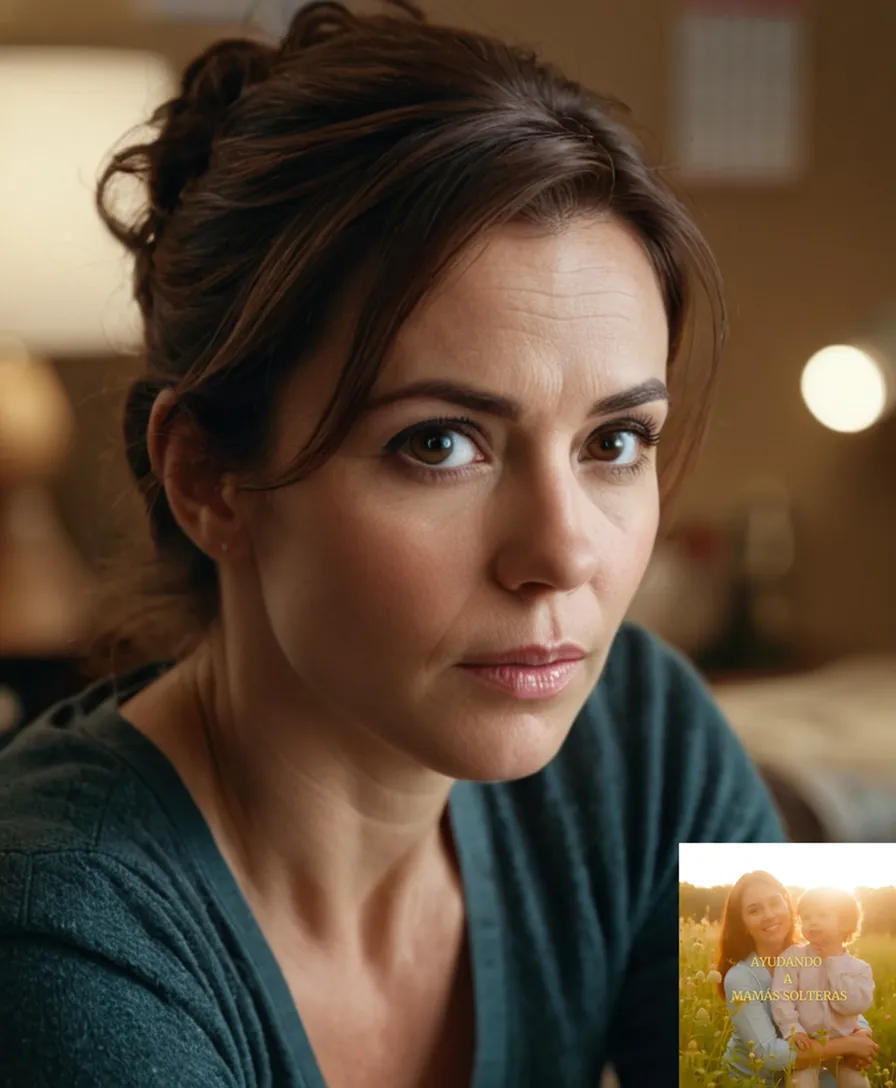 Ayuda económica para madres solteras: La imagen debe mostrar a una mujer latina de mediana edad con una expresión suave de pie frente a una casa modesta