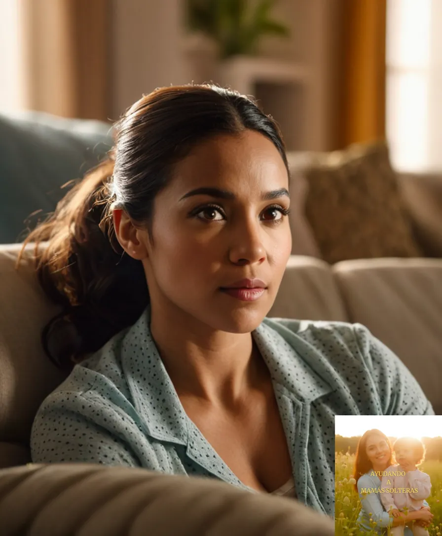 The image should show a warm and hopeful portrait of a single mother in her mid-30s, sitting on a worn couch with a notebook and pen nearby, surrounded by modest but welcoming family photos and heirlooms, looking directly at the viewer with a determined expression.